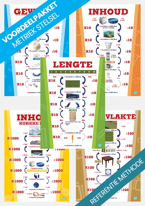 Onze metriekposters zijn er in 2 varianten. Een volgt de bekende ’trapmethode’, de ander gaat uit van realistisch rekenen vanuit de afbeelding.