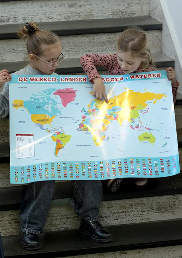 De enige echte Wereldkaart poster in het Nederlands, compleet met alle vlaggen van de wereld. Perfect om met de kinderen te oefenen en ze een beter beeld te geven van waar welk land ligt. Of bekijk het heelal met onze Zonnestelsel poster, waar ligt de aarde?