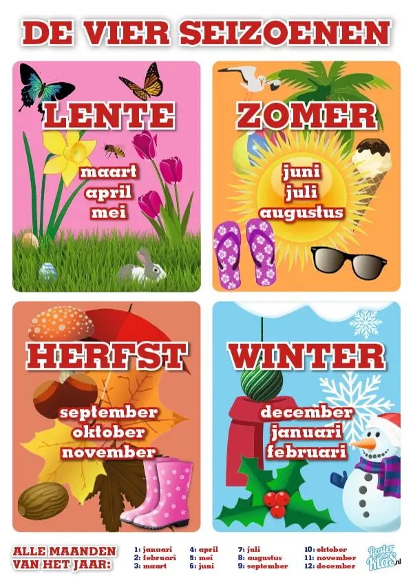 De seizoenenposter geeft door middel van passende afbeeldingen de 4 seizoenen weer: zomer, herfst, winter en de lente. ook vind je onderaan een overzicht van de 12 maanden van het jaar.