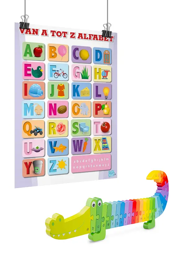 Nu nieuw bij Posterindeklas.nl. We combineren onze lesposters met kwalitatief educatie materiaal. In dit geval met een mooi houten alfabetkrokodil waarmee het alfabet geleerd kunnen worden. Zo kan onze alfabetposter dienen als uiteg en kan de krokodil gebruikt worden om kinderen de gekleurde puzzelstukjes in de juiste vorm te leggen en zo het volledige alfabet op een rij te zien. Leuk en leerzaam. Deze puzzel bestaat uit 26 stukken om zo het alfabet compleet te maken.