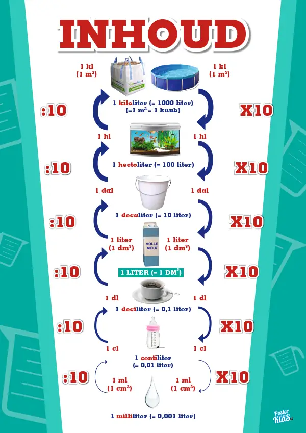 Bij deze set posters van het metriek stelsel wordt de trap methode gebruikt. Dat is een methode die vaak in het onderwijs gebruikt wordt om de verschillende maateenheden uit te leggen. Het metriek stelsel kan je zien als een soort trap waarbij elke trede van de trap staat voor een eenheid. Bijvoorbeeld voor de GEWICHT poster staan op de hoogste traptrede de kilogrammen. Hoe lager je gaat op de trap, hoe kleiner de maateenheid. Op de laagste traptrede staan dus de milligrammen. Ga je een traptrede naar beneden dan moet je vermenigvuldigen met 10. Ga je een traptrede naar boven dan moet je delen met 10. Met behulp van de trap methode kunnen leerkrachten het metriek stelsel gemakkelijk uitleggen aan de kinderen.