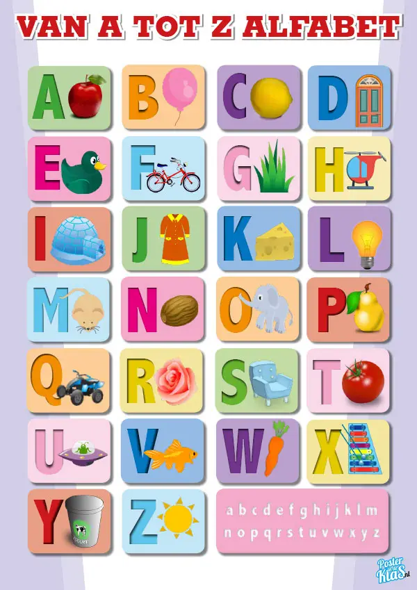 De poster alfabet A-Z spreekt voor zich. Elke letter van het alfabet is gekoppeld aan een realistische afbeelding, zodat het jonge kind direct een herkenning heeft en houdt bij de bijbehorende letter. Dagelijks kan de leerkracht refereren aan de afbeeldingen en de gekoppelde letters. De poster alfabet A-Z hebben we ontworpen niet alleen voor de onderbouwgroepen van de basisschool, maar ook zeker voor de voor- en naschoolse opvang. Juist in deze lokalen zorgt een dergelijke poster voor een didactische meerwaarde aan taal en geeft het de omgeving een professioneel uiterlijk.
